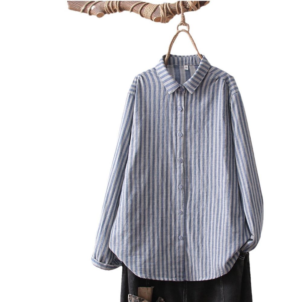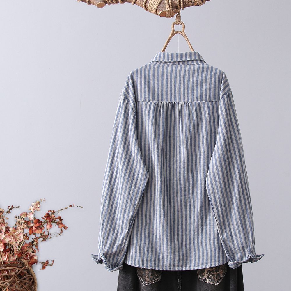 Women's Literary Casual Lapel Striped Double-Layer Cotton Gauze Long Sleeve Shirt